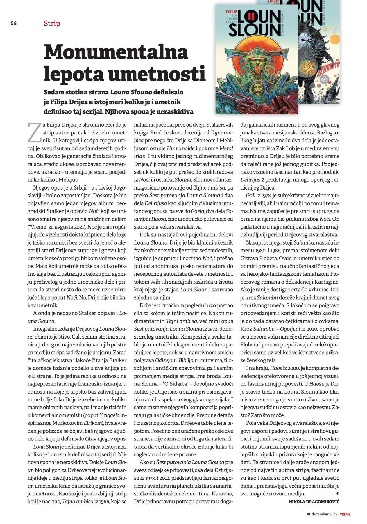 U #1824 broju nedeljnika Vreme (18. 12. 25) novinar i urednik Nikola Dragomirović predstavio je naš Stelarni integral, koji daje uvid u veći deo svaralačke karijere Filipa Drijea.